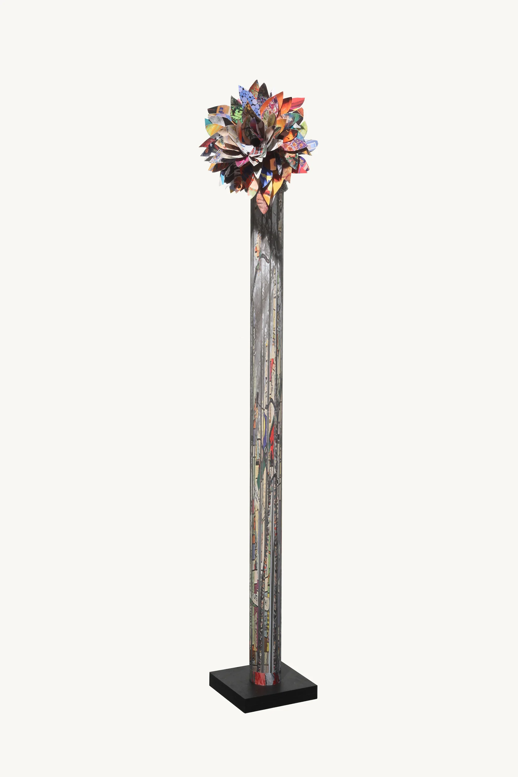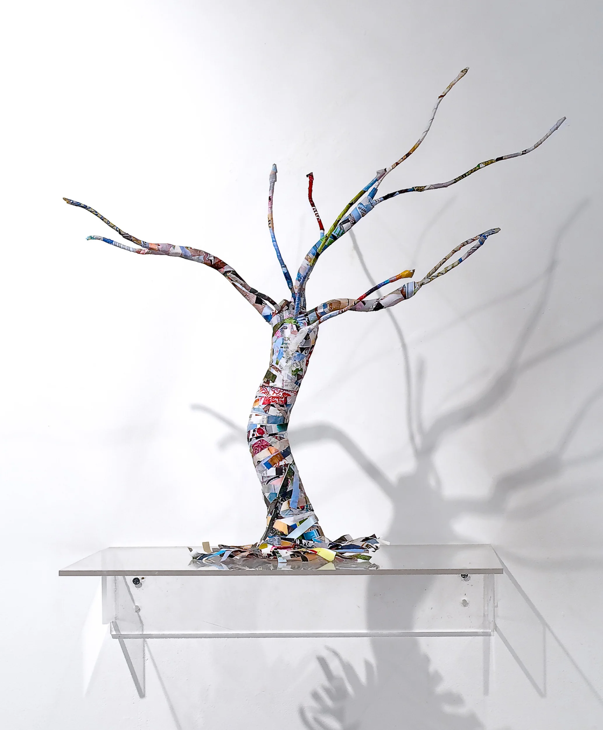 The sculptures presented here represent a continuation of the recycling process in my art. While primarily created with products derived from trees, like paper, cardboard and wood, there are also recycled elements among which are plastic water bottle parts, metal tubing and even kitchen scrubbing pads.